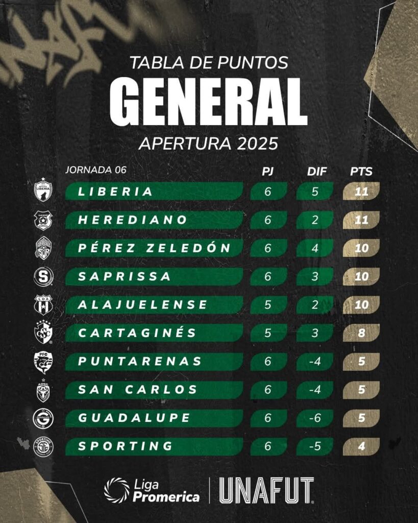 Este martes finalizó la sexta jornada del torneo de apertura 2025. Cartaginés y Alajuelense adeudan un juego al torneo que fue programado para el 11 de Octubre.