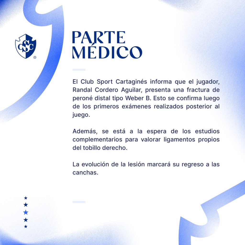 Este lunes, el Club Sport Cartaginés confirmó una nueva baja por lesión. Se trata de Randal Cordero.