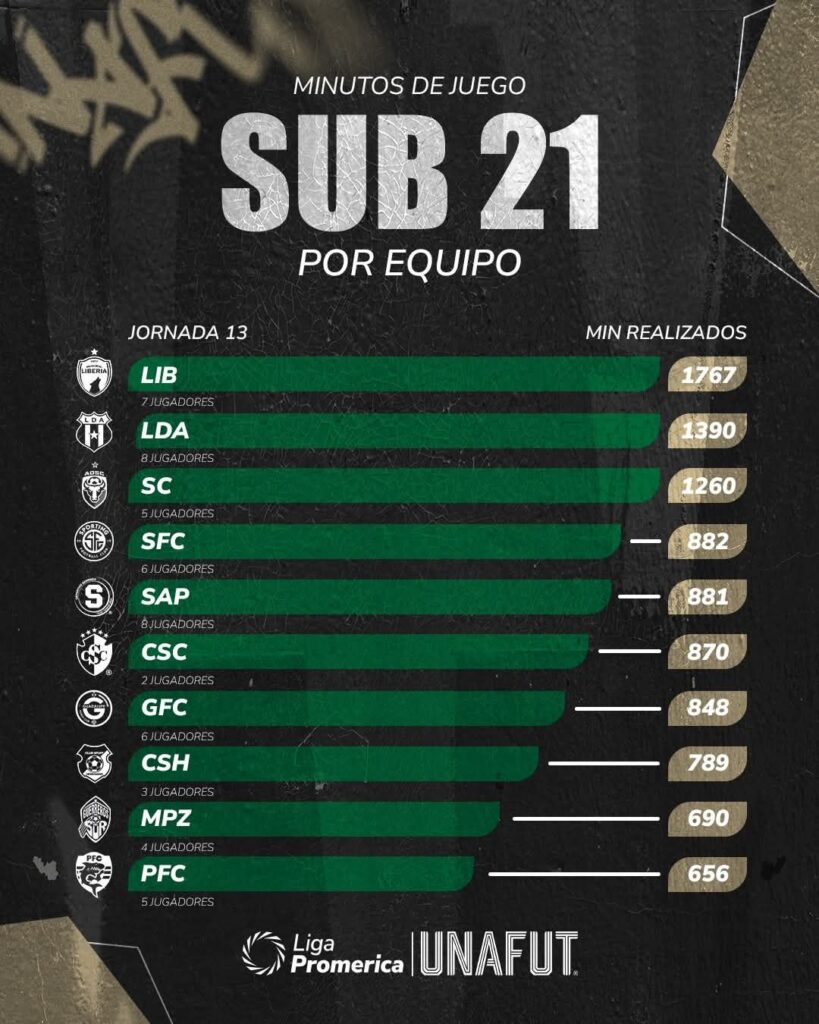 Este jueves, la UNAFUT presentó el reporte de minutos sub 21 acumulados por los clubes a la fecha 13 del Apertura 2025.